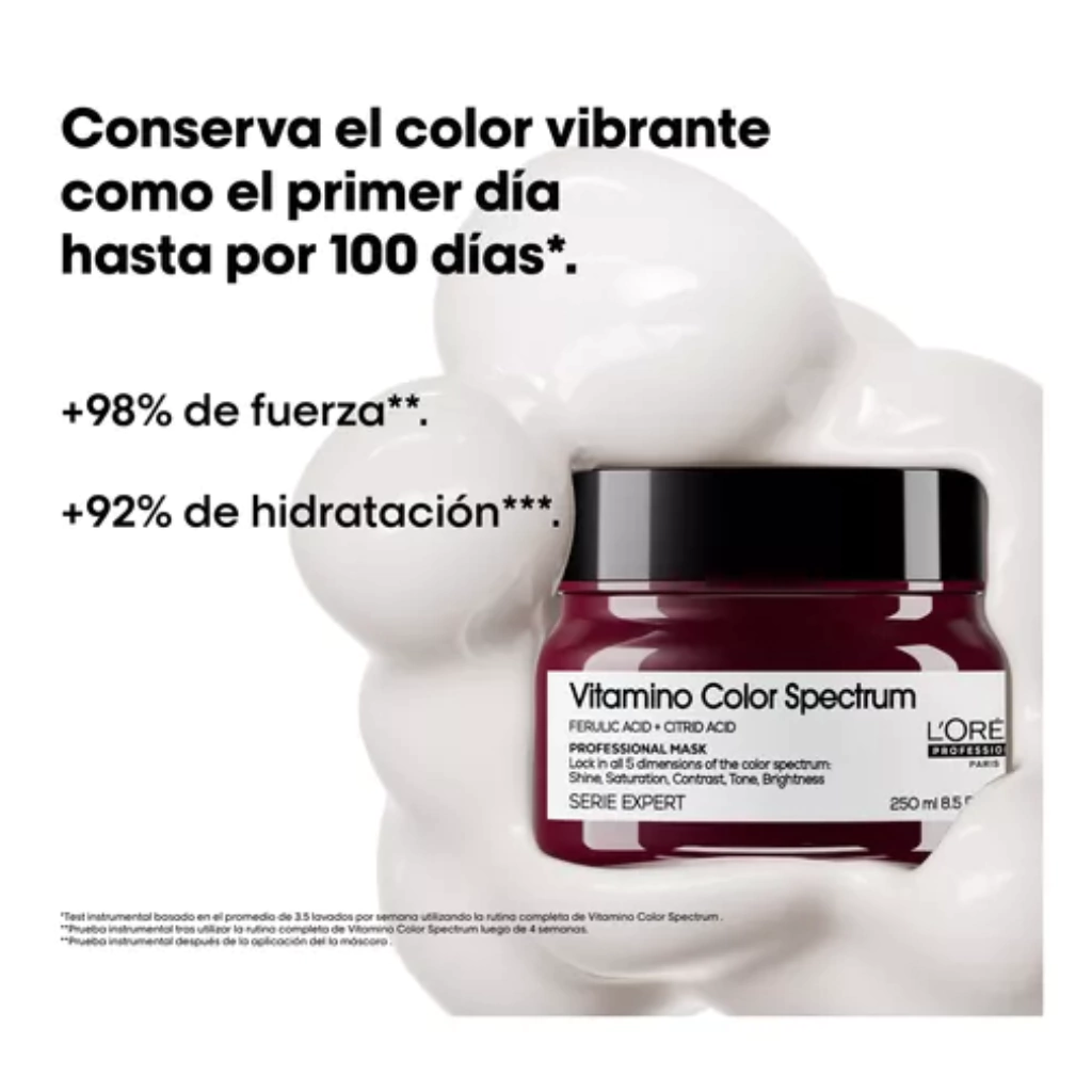 Máscara Vitamino Color Spectrum Professional de L'Oréal Professionnel, formulada con Ácido Ferúlico + Ácido Cítrico. La rutina completa mantiene las moléculas de color en el interior de la fibra para conservar el color vibrante como el primer día hasta por 100 días*. Eficacia probada en las 5 dimensiones de color**: 1. Brillo: Brillo ultra reluciente. 2. Saturación: Colores intensos y vibrantes. 3. Contraste: Profundidad óptima entre múltiples tonos. 4. Tono: Reflejos no deseados son neutralizados. 5. Luminosidad: El nivel de luminosidad y oscuridad es bien conservado. La fórmula de la máscara viene con una textura cremosa que se extiende uniformemente sobre el cabello para hidratar la fibra capilar y lograr un cabello más fuerte y suave. *Test instrumental basado en el promedio de 3.5 lavados por semana utilizando la rutina completa de Vitamino Color Spectrum.
